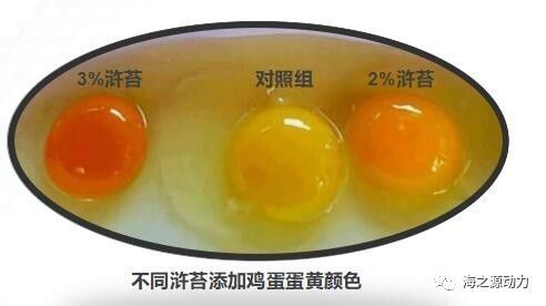 浒苔粉在蛋鸡生产中的应用 在基础饲料中添加适量浒苔粉饲养蛋鸡能显著改善蛋黄颜色,对蛋鸡产蛋性能及鸡蛋品质也均有不同程度的提高。在仙居鸡日粮中添加一定量的浒苔粉能在一定程度上降低血清总胆固醇、甘油三酯及 MDA 含量,显著提高血清高密度脂蛋白胆固醇含量 (P<0.05)。在蛋鸡日粮中分别添加浒苔干粉 1%、2% 和 3%,结果表明,3 种添加比例的浒苔均可极显著提高蛋鸡的产蛋率和日产蛋量 (P<0.01),并能显著改善料蛋比 (P<0.05)。在蛋鸡日粮中分别添加浒苔干粉 2%、3% 和 4%,结果表明,4% 添加组的蛋黄色度、磷脂、粗蛋白质、铁和碘含量均显著提高,血清钾、总蛋白、白蛋白含量均显著提高 (P<0.05),血清超氧化物歧化酶的活性显著提高 (P<0.05),蛋黄中胆固醇含量显著降低 (P<0.05),血清胆固醇和甘油三酯含量和谷丙转氨酶的活性显著降低 (P<0.05)。在海兰褐蛋鸡日粮中分别添加浒苔干粉1%、2% 和 3%,均显著或极显著改善了平均蛋重、蛋壳中钙含量和蛋黄颜色(P<0.05 或P<0.01),显著降低了料蛋比和蛋黄中胆固醇含量 (P < 0.05),2% 和 3% 组粪便中大肠杆菌数量显著或极显著降低 (P<0.05 或P<0.01),双歧杆菌数量分别显著或极显著提高 (P<0.05 或 P<0.01),1% 和 2% 组乳酸杆菌数量分别显著或极显著提高 (P<0.05 或P<0.01)。浒苔粉在肉鸡生产中的应用